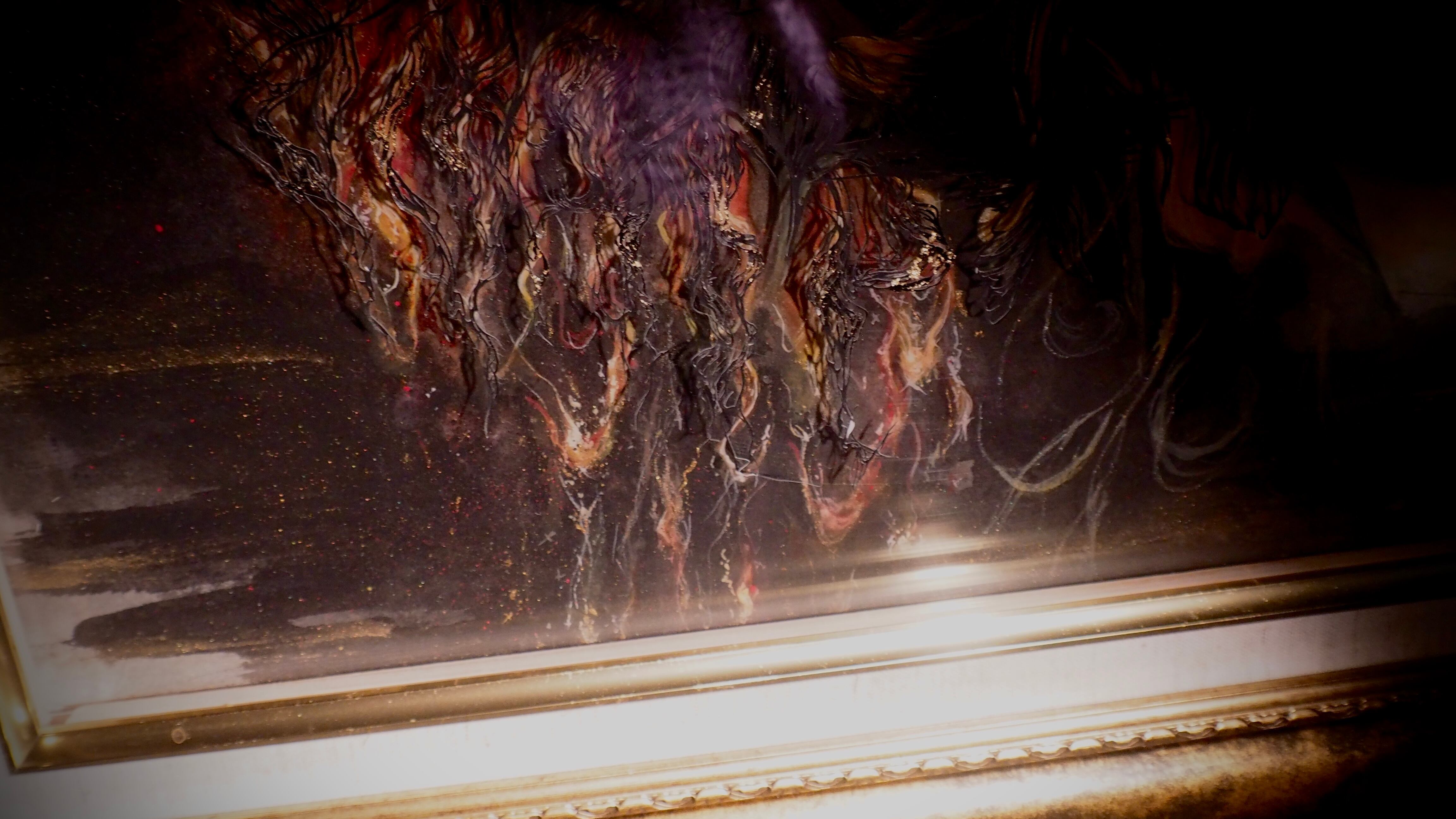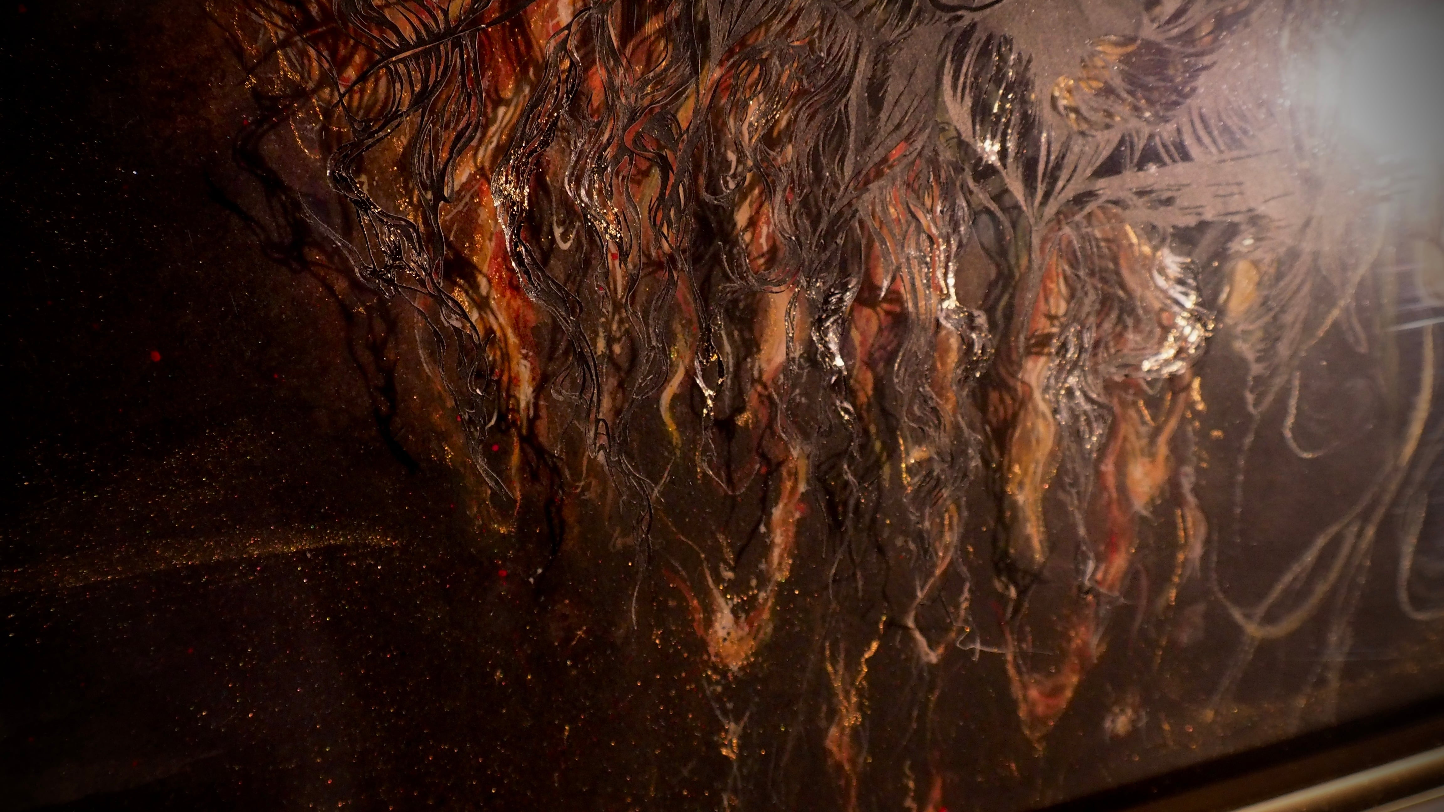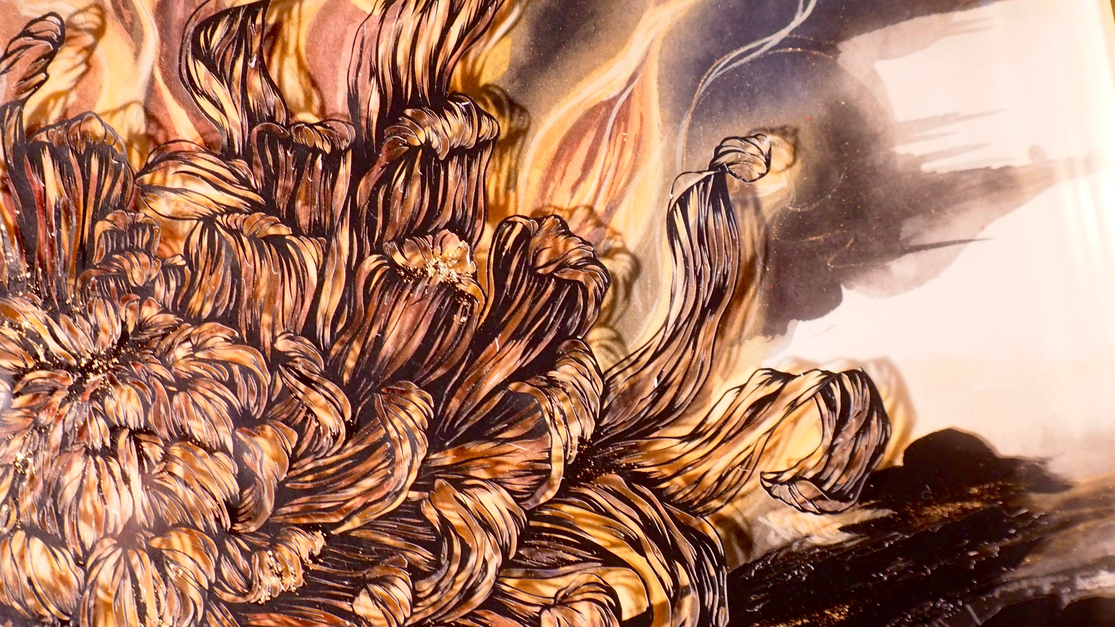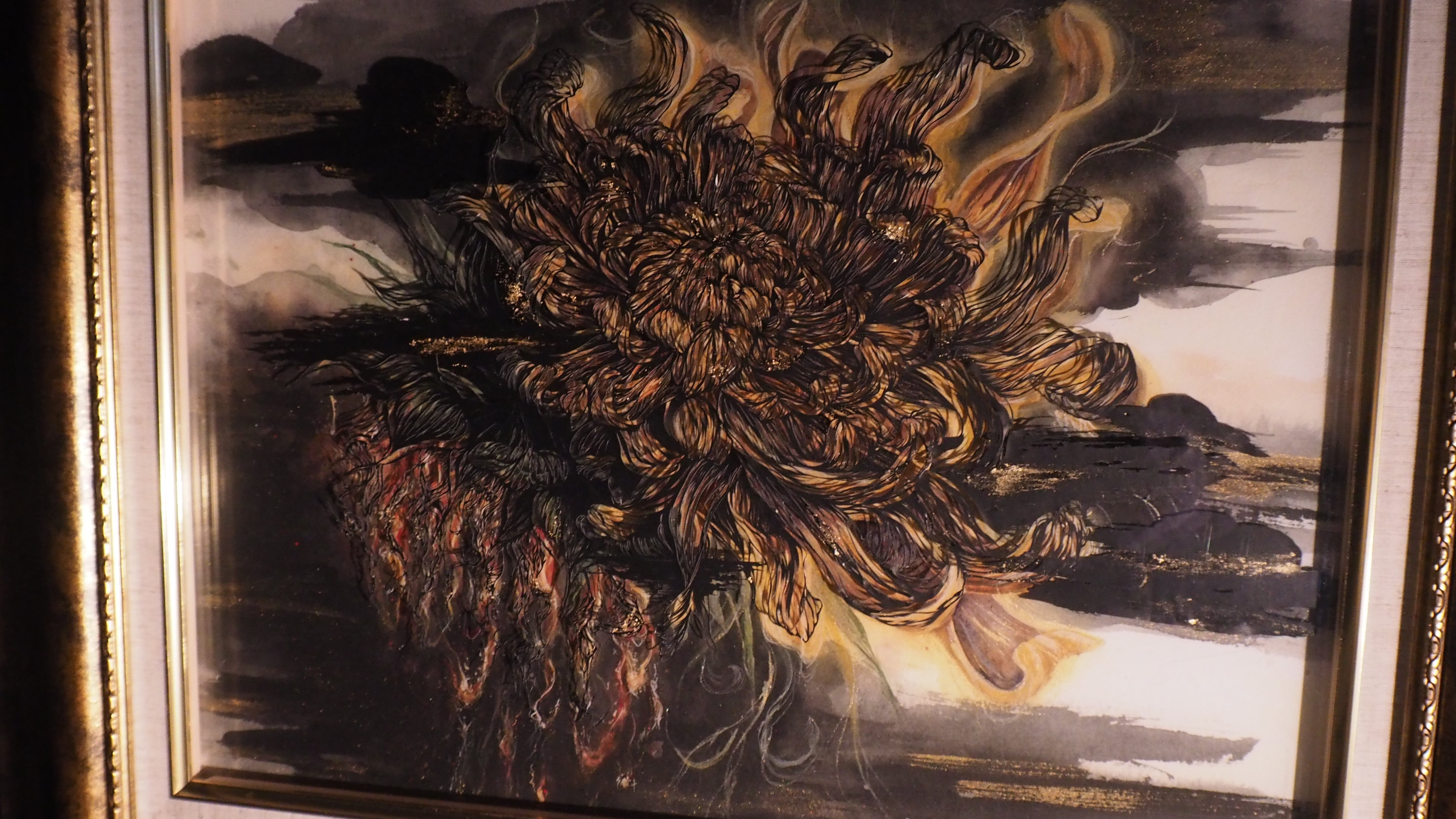 咲き誇る菊の花の下に枯れかけのひまわりの花を描いた作品です。