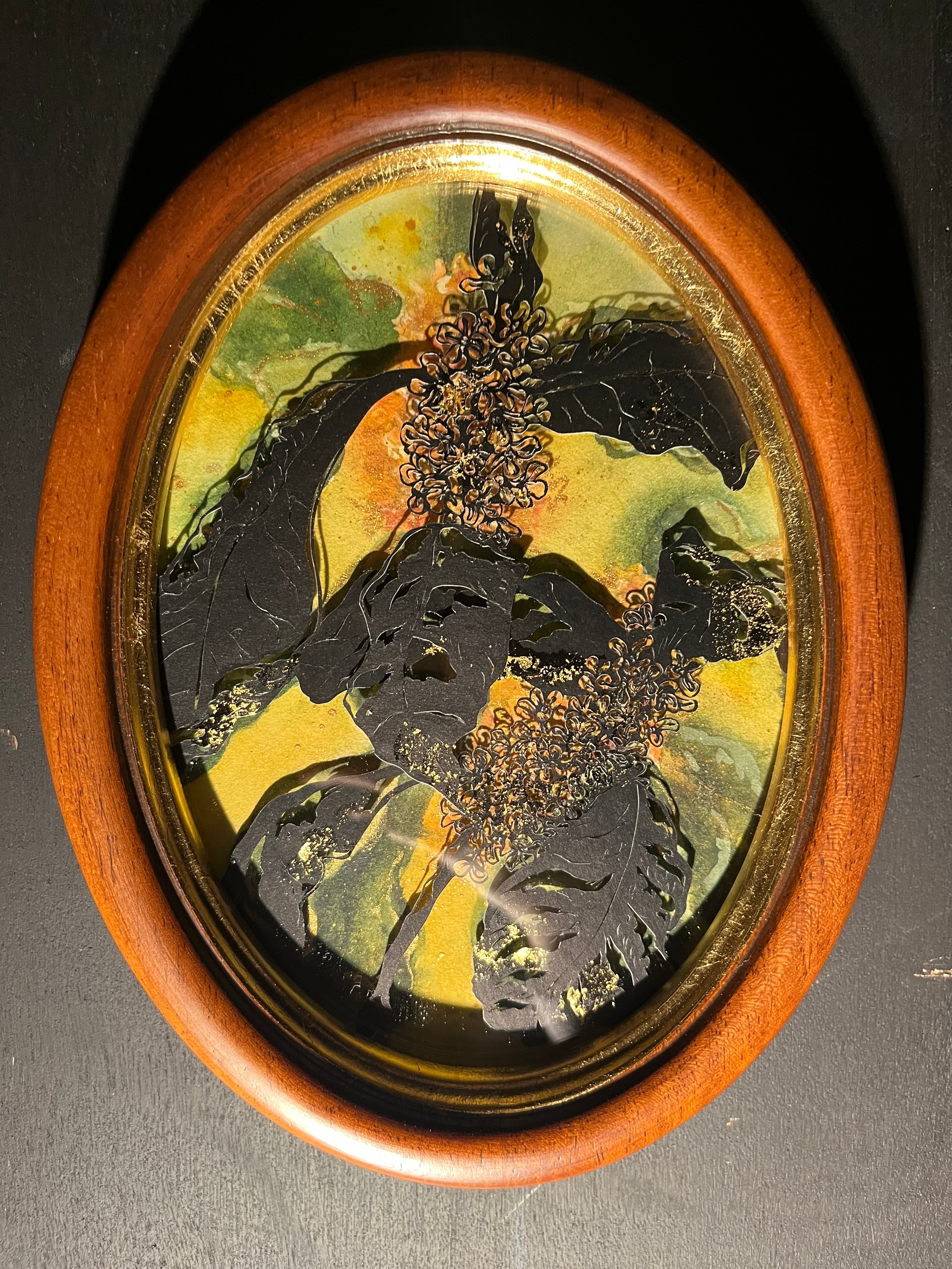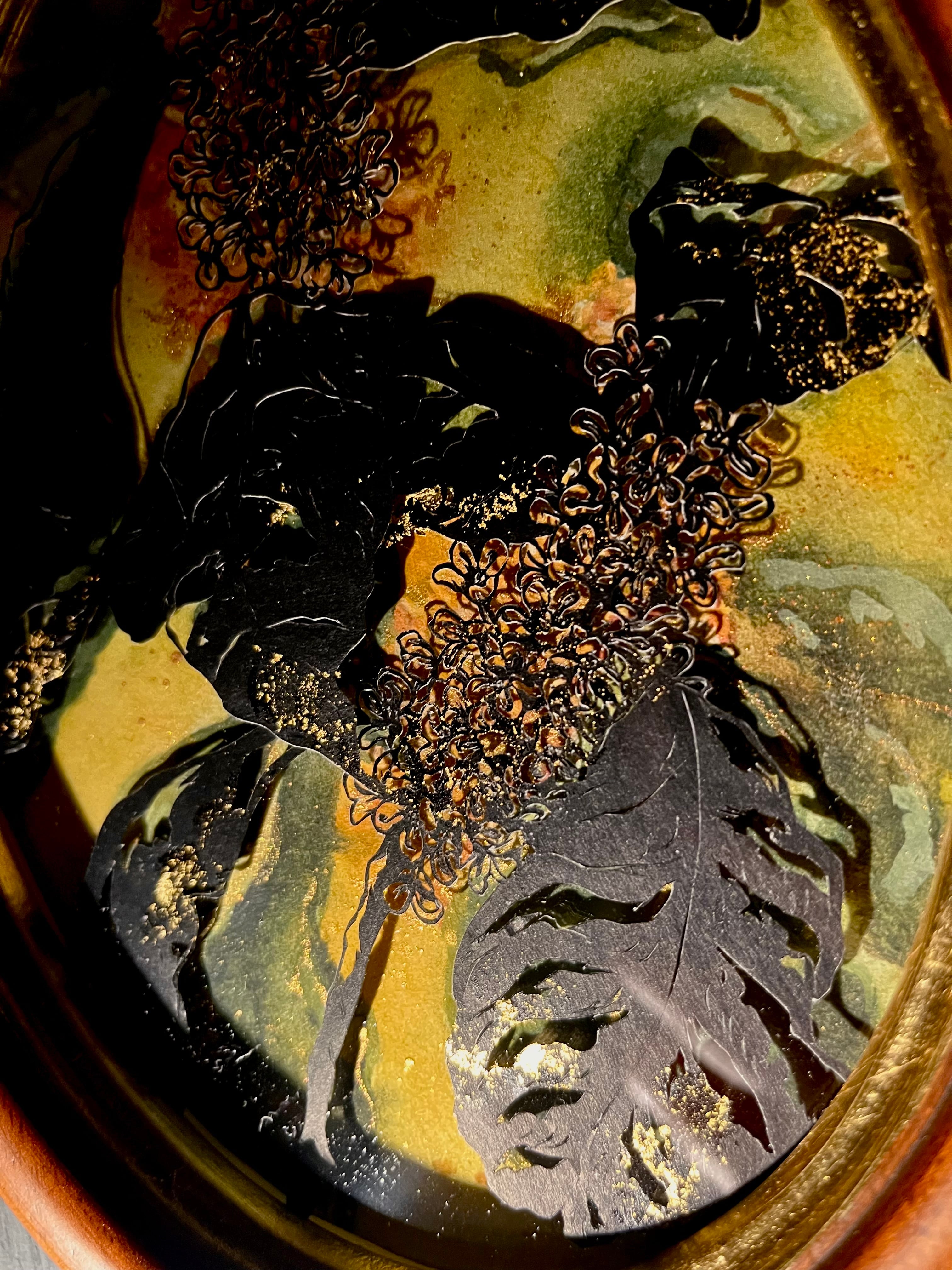 秋の日差しに照らされて咲く金木犀をモチーフに制作しました。